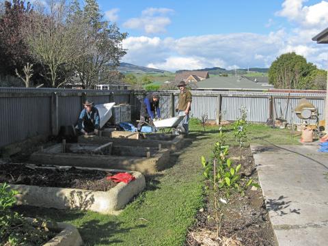 With big thanks to Garden Coordinator Toni O'Brien and her family, the broken concrete has been cut and removed, making room for several new fruit trees, including one more feijoa, some citrus, and a plum. A team led by Aaron Roberts and Harvey Jones have also just put in three more garden beds in a well-attended hypertuffa workshop. That's them in the photo, plus volunteer Bev Swanson. We'll have lots of places to plant Spring veggies, hurrah!