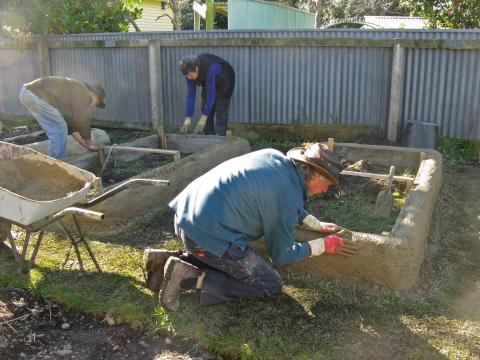 At the Ashhurst Community Library Garden, RECAP used wooden boxing as a mold to make the different beds as uniform as possible. The mixture can be mounded into a kerb wall without the need of boxing, however, just by building it up like mud pies and vibrating the sides with your hands. Too much shaking and it will turn into quicksand. Let it dry off and set a little and then build up another layer for increased height.