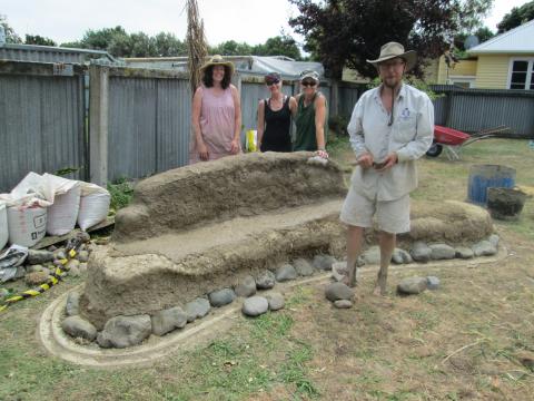 Thanks to the participation of over forty members of the Ashhurst, Pohangina, Palmerston North, Feilding, and Whanganui communities, the earth-bench at the Ashhurst Community Library has taken shape, with the cob construction now complete.